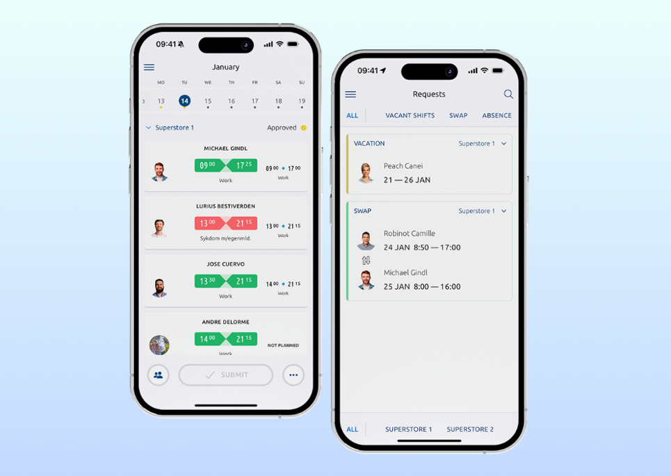Anpassa snabbt bemanningen under högsäsong, vid oväntad frånvaro eller extra arbetsuppgifter. Godkänn arbetspass, frånvaro och ändringar direkt i appen under intensiva perioder.
