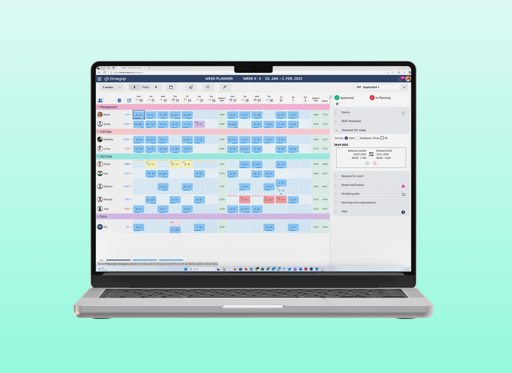 Därifrån går cheferna in med verktyg för att skapa effektiva scheman, godkänna byten och säkerställa smidig drift. Allt är designat för att stödja snabba beslut med datastödd säkerhet.